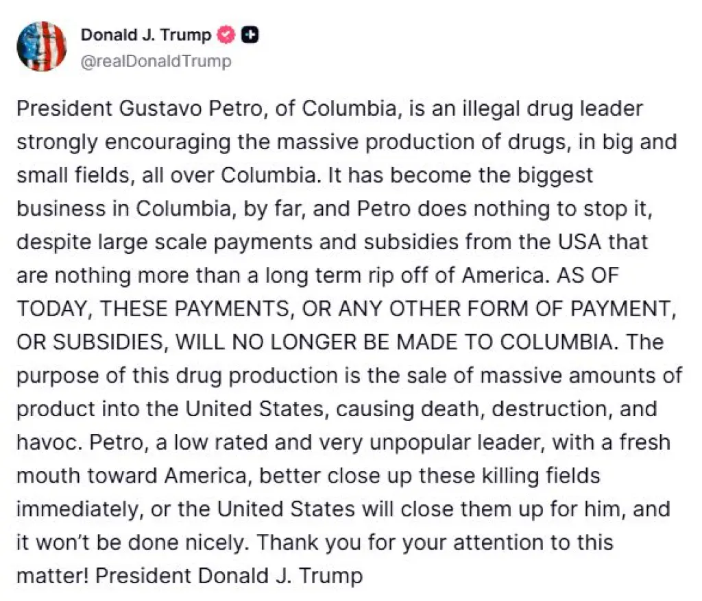 “El presidente de Colombia, Gustavo Petro, es un líder del narcotráfico que impulsa intensamente la producción masiva de drogas en todo el país, tanto en grandes plantaciones como en pequeñas parcelas”, escribió Donald Trump en su cuenta de Truth Social.
