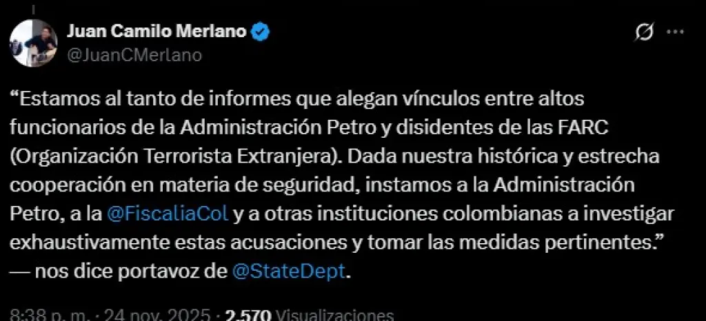 “Estamos al tanto de informes que señalan vínculos entre altos funcionarios de la Administración Petro y disidentes de las FARC (Organización Terrorista Extranjera). Dada nuestra histórica y estrecha cooperación en materia de seguridad, instamos a la Administración Petro, a la Fiscalía y a otras instituciones colombianas a investigar exhaustivamente estas acusaciones y a tomar las medidas pertinentes”, declaró el portavoz a periodistas en la Casa Blanca.