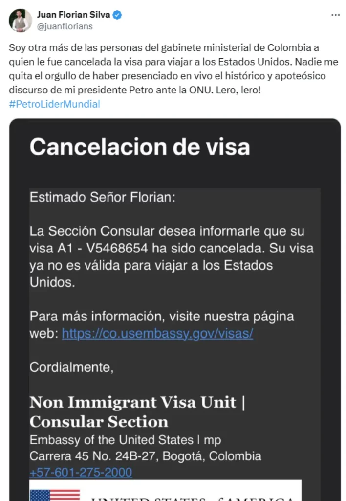 “Soy otra más de las personas del gabinete ministerial de Colombia a quien le han cancelado la visa para ingresar a Estados Unidos. Nadie me quita el orgullo de haber presenciado en vivo el histórico y grandioso discurso de mi presidente Petro ante la ONU. ¡Lero, lero! #PetroLiderMundial”, escribió en su cuenta de X.