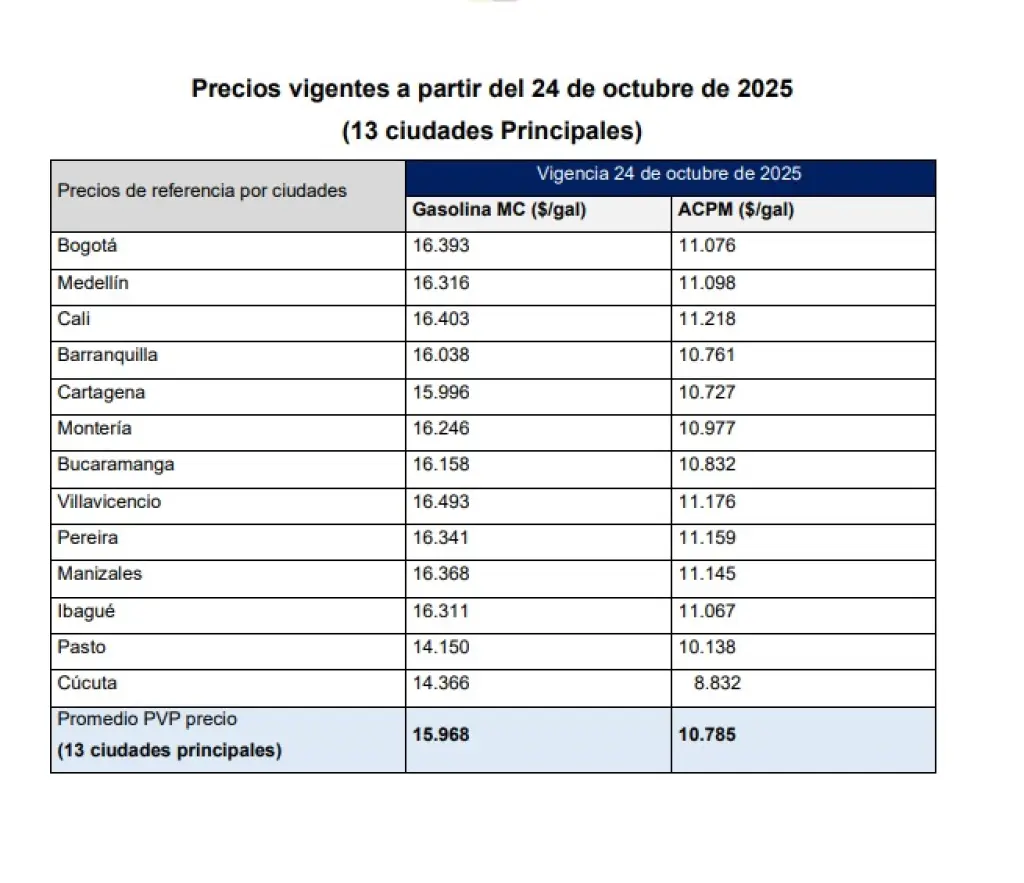 A partir de este viernes 24 de octubre, los precios de la gasolina y el diésel en Colombia aumentarán 100 pesos, según informó la CREG.